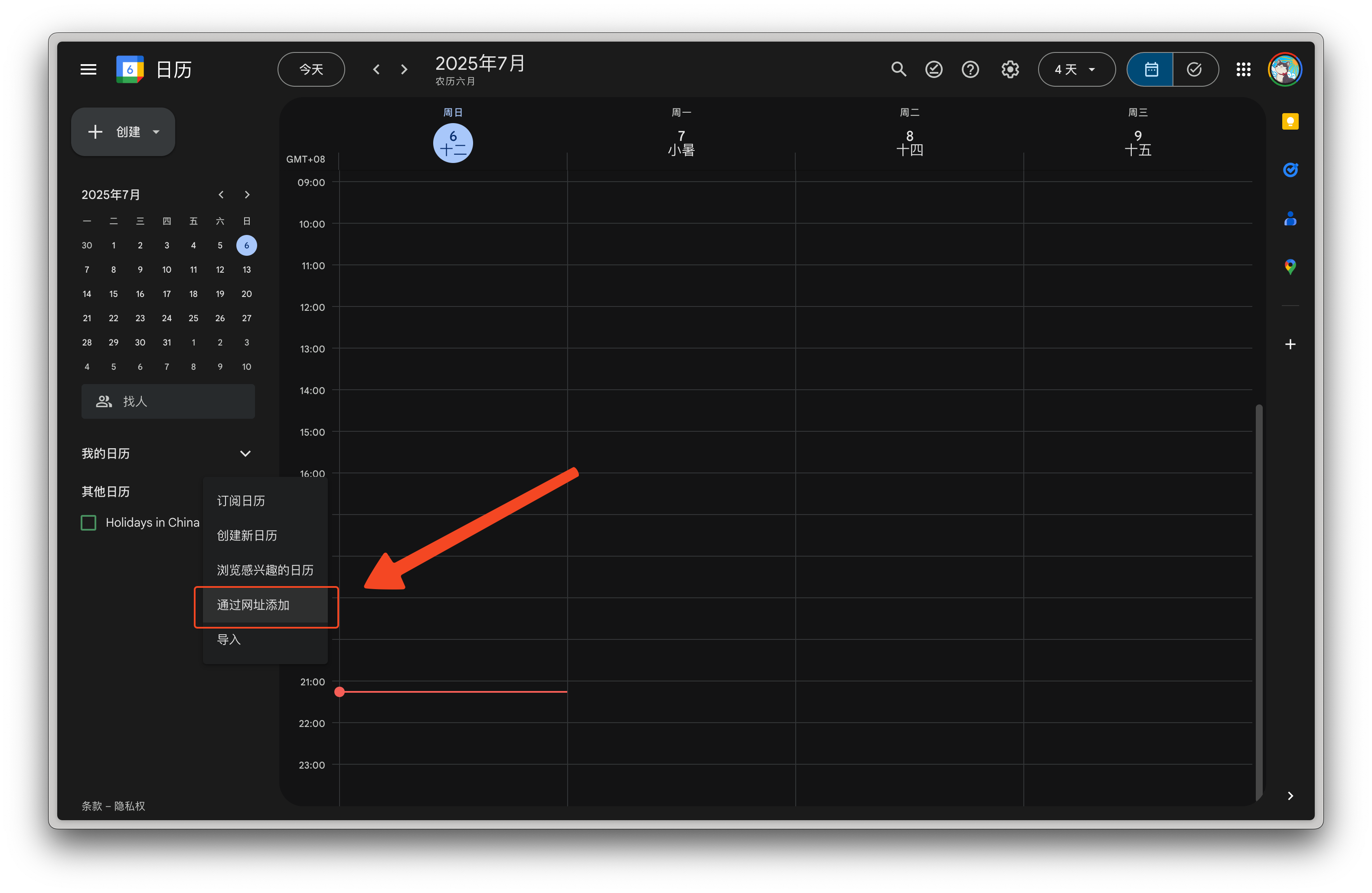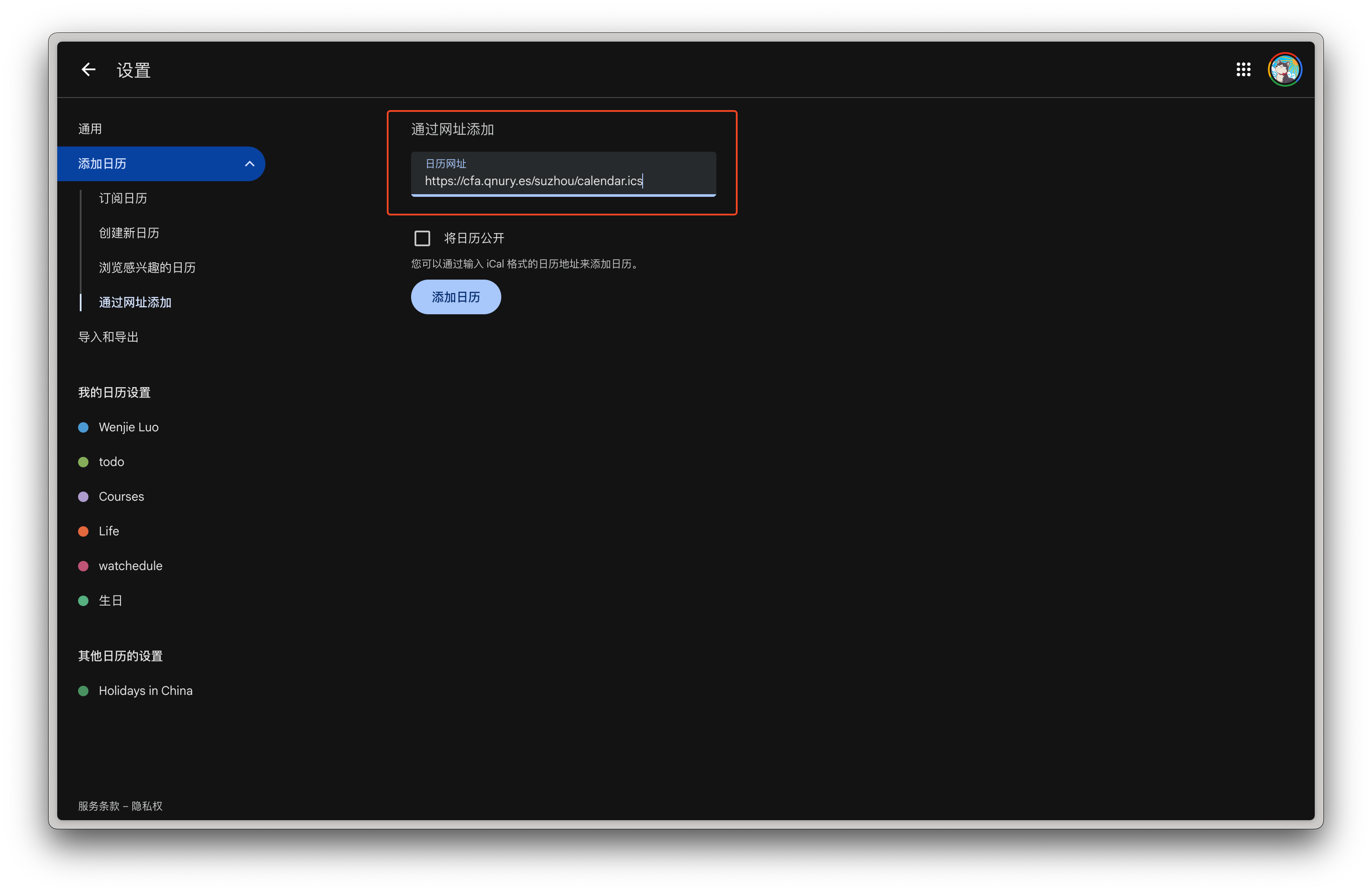 输入订阅链接。比如我常住苏州,比较关注苏州的片单,则可输入 https://cfa.qnury.es/suzhou/calendar.ics