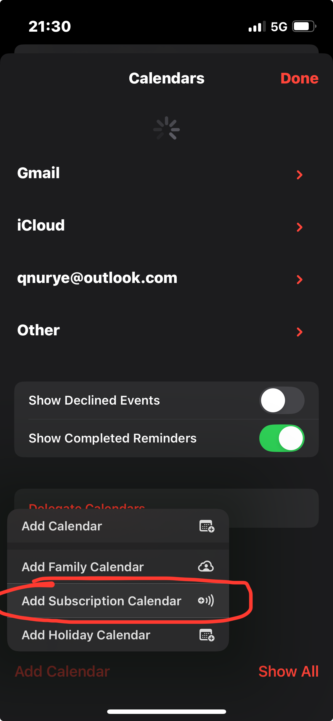 以 iOS 端为例。类似上面提到的 Google Calendar 操作方法,在 iCloud Calendar 中,点击主界面下部的 日历,点击左下角的 添加日历订阅,进入订阅日历新建页面。