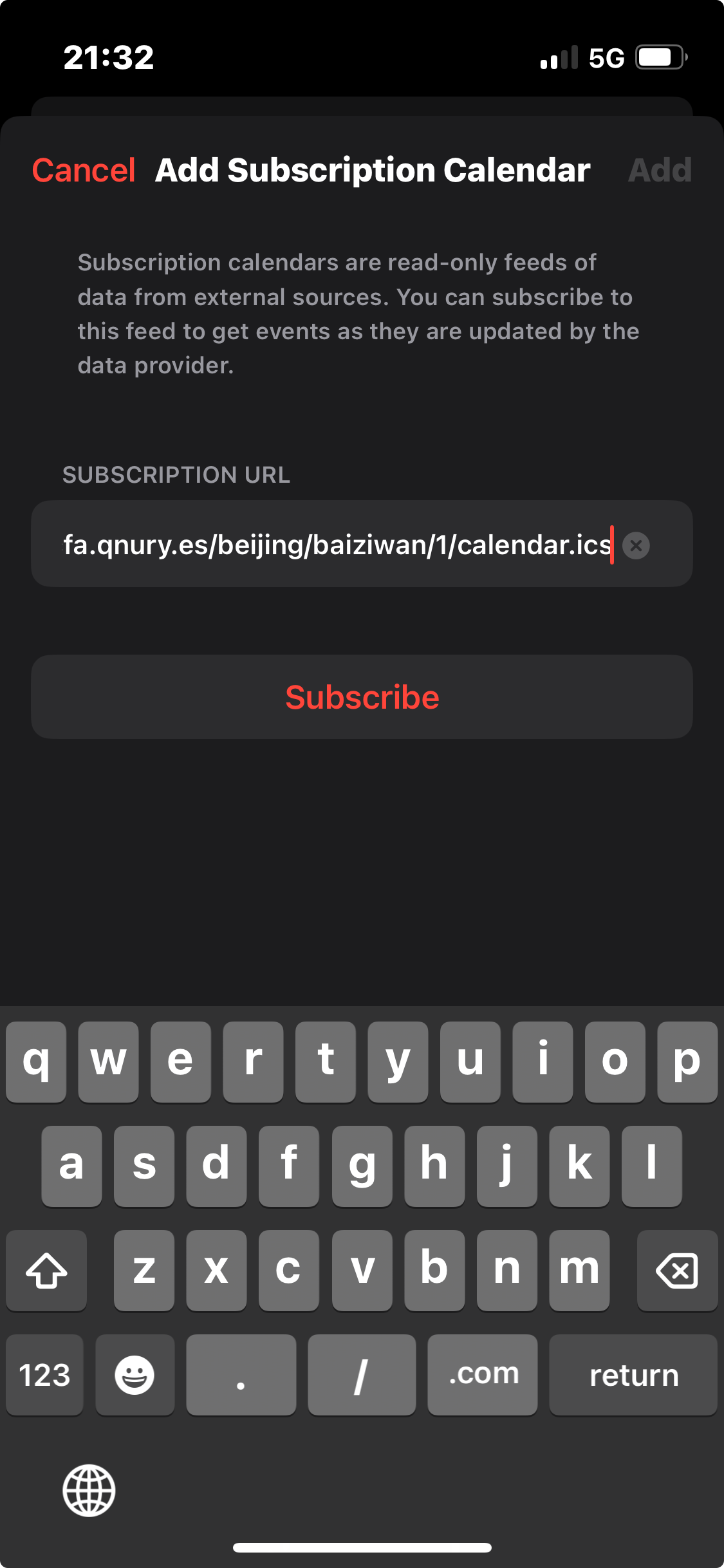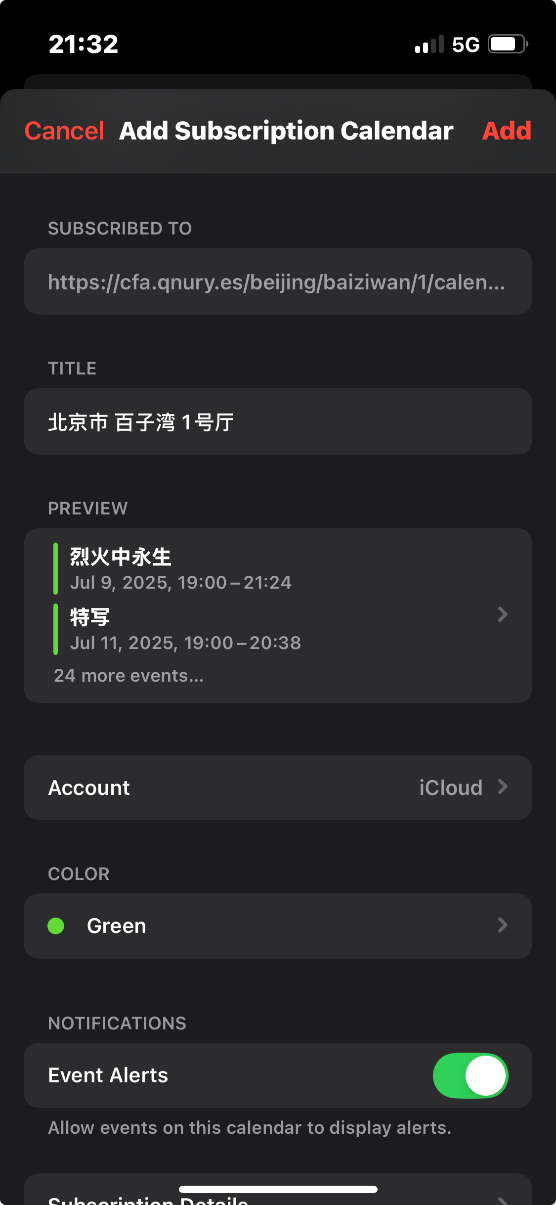 假如我是常住在北京市百子湾地区的居民,更关注百子湾 1 号厅的排片,那么这次我可以填入 https://cfa.qnury.es/beijing/baiziwan/1/calendar.ics。输入完成后,点击 订阅 按钮,即可完成订阅。